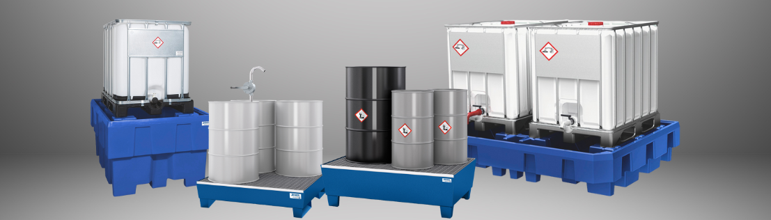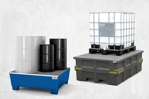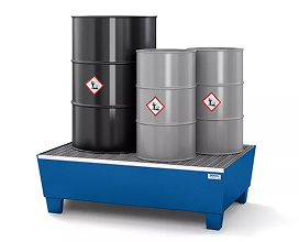 DENIOS钢制盛漏托盘用于安全存放圆桶或吨桶。它们适用于...