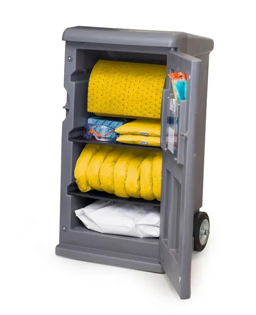 泄漏应急推车可以被迅速推到泄漏现场。推车内配备吸附索、吸附垫、吸附枕用于快速吸收泄漏液体。同时配备齐全的个人防护设备,如安全眼镜、防护手套等,供事故现场使用