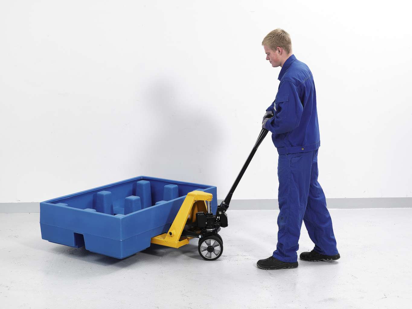 - 底座上的叉车口可使圆桶搬运车、托盘车和叉车安全地运输和装载圆桶
